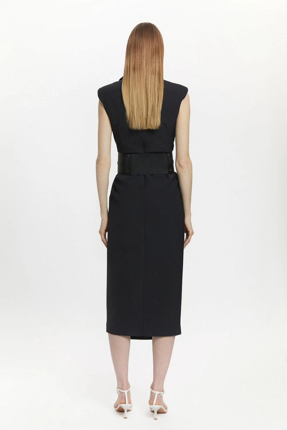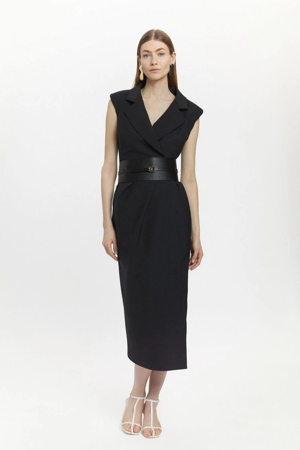 Exude undeniable sophistication in this tailored midi dress. Nodding to traditional tailoring, notched lapels embrace a directional mood, while a statement belt cinches the waist to create an hourglass silhouette.