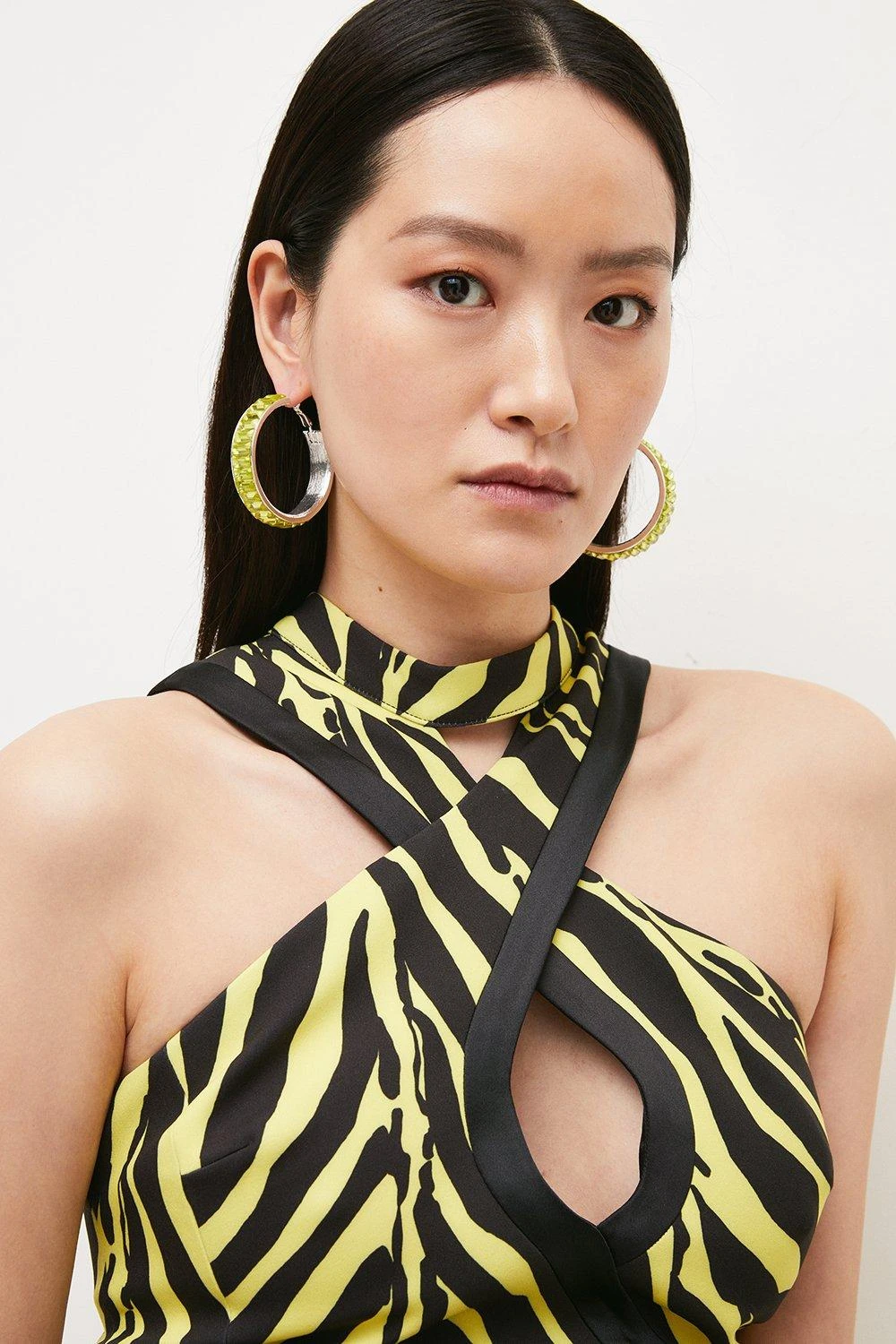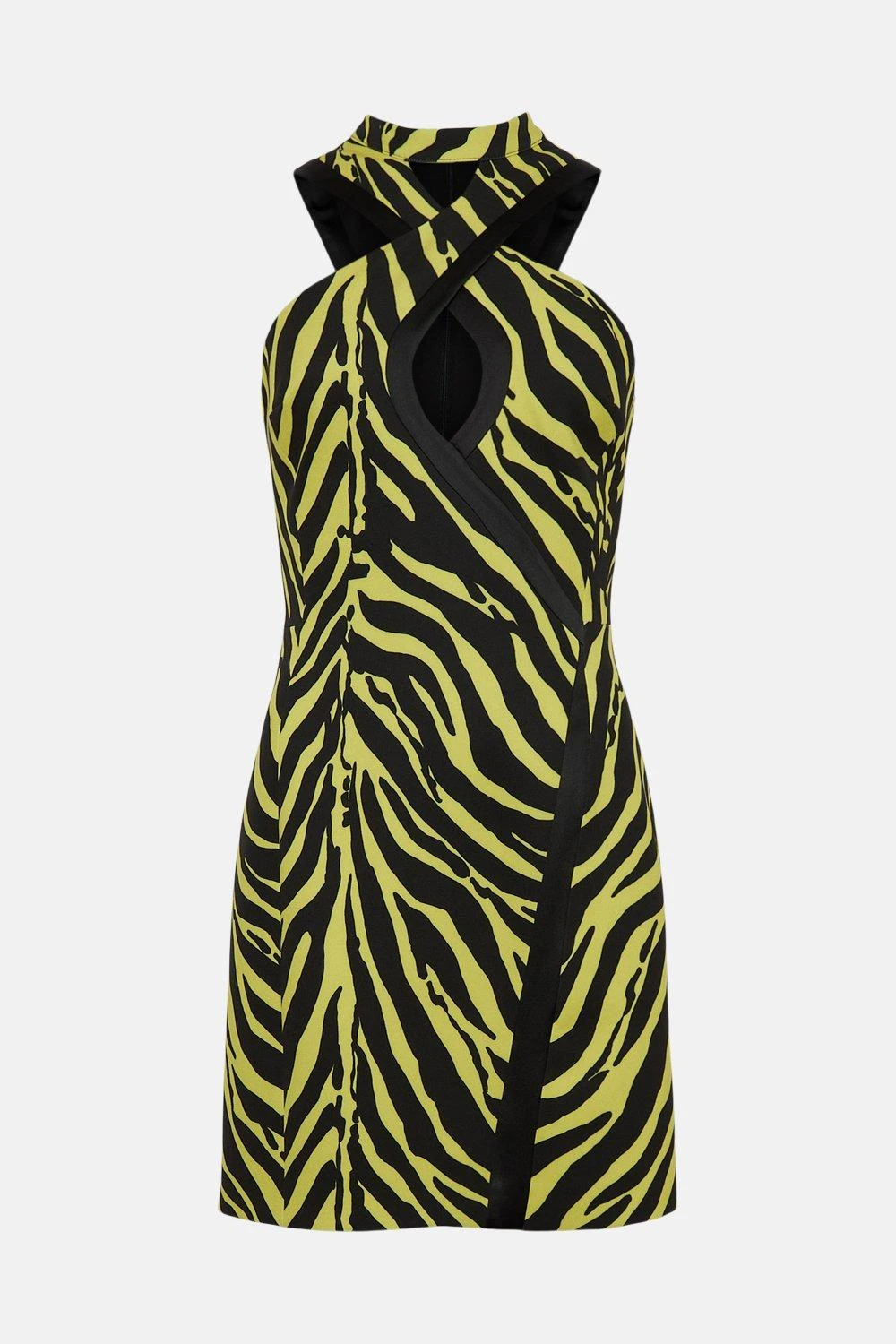 Adorned with neon zebra stripes, this bold-and-beautiful mini dress was designed to stand out. It shows off a unique crossover halter neckline, seductive front keyhole cut-out and flat ribbon trims for a touch of texture. Fitting closely to the figure and cut to a sultry above-knee fit, this vibrant design was made for date night.