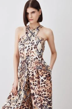 Karen Millen Animal Print Premium Linen Viscose Halter Woven Jumpsuit